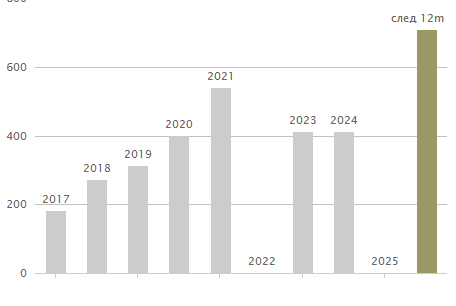 С 2009го по декабрь 2024й (15 лет) Магнит выплатил в сумме чуть больше 3680 рублей дивидендов. Средняя цена за время существования 6.867рупь, текущая 4.351рупь. График дивидендных выплат даже очень неплохой.