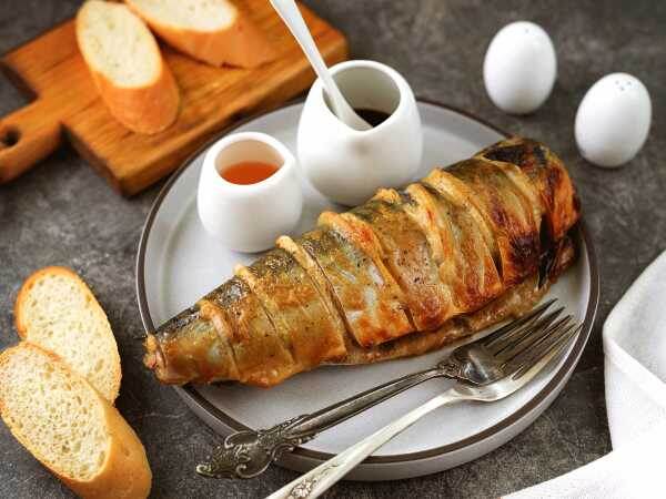 Когда тушка будет полностью разморожена, сделайте поперечные надрезы вдоль всей спинки с одной стороны. Нарежьте полукольцами репчатый лук, вложите его в каждый надрез и брюшко. Щедро смажьте скумбрию приготовленным ранее соусом из горчицы и майонеза.