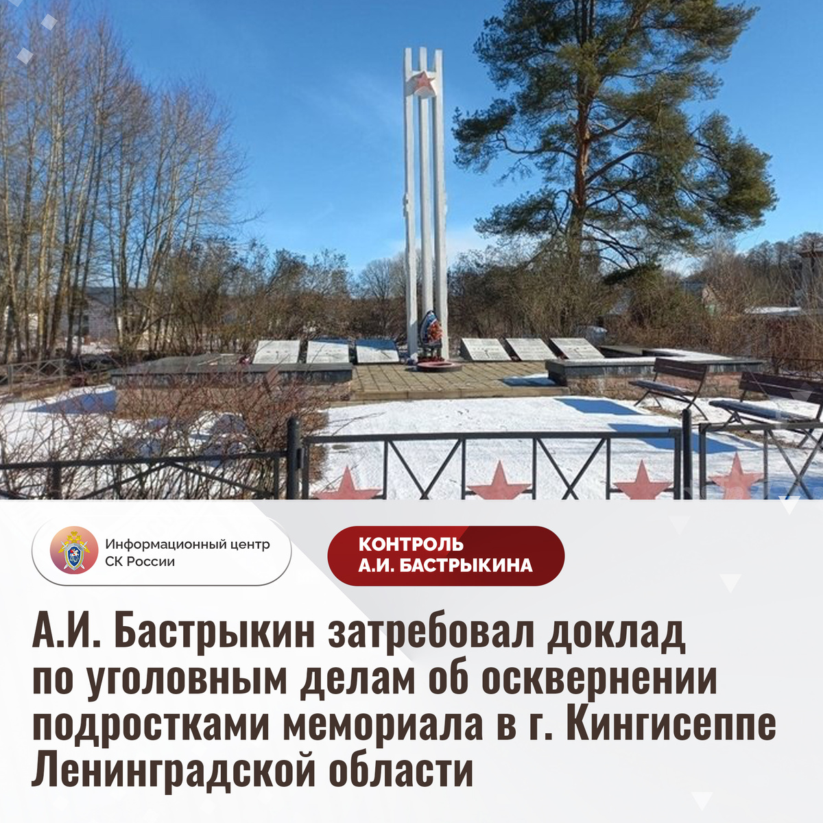 А.И. Бастрыкин затребовал доклад по уголовным делам об осквернении подростками мемориала в г. Кингисеппе Ленинградской области В СМИ сообщается, что 23 марта текущего года в городе Кингисеппе Ленинградской области двое подростков осквернили мемориал «Роща Пятисот», посвященный массовому расстрелу красноармейцев в годы Гражданской войны, потушив Вечный огонь. В СУ СК России по Ленинградской области по данному факту возбуждены уголовные дела. Председатель Следственного комитета Российской Федерации Александр Иванович Бастрыкин затребовал у руководителя СУ СК России по Ленинградской области Сергея Тихоновича Сазина доклад о ходе и результатах расследования уголовных дел. Исполнение поручения поставлено на контроль в центральном аппарате ведомства. #СледственныйКомитет #СКРоссии #СКР #ИЦСКР #ИнформационныйЦентр #АлександрБастрыкин #ПредседательСКР #КонтрольПредседателяСКР #КомментарийКонтроль #ЛенинградскаяОбласть