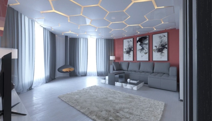 - Эстетичный внешний вид: натяжные потолки позволяют создать идеально ровную и гладкую поверхность, скрывая любые дефекты базового потолка: неровности, трещины, коммуникации. Широкий выбор цветов, фактур (матовые, глянцевые, сатиновые) и возможность нанесения фотопечати открывают безграничные возможности для дизайна интерьера.