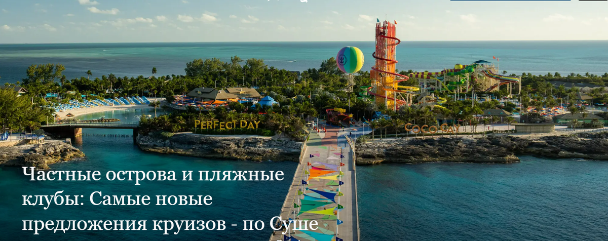 Днём ранее «Utopia of the Seas» пришвартовалась на частном острове Royal Caribbean для проведения «Идеального дня на Коко-Кей». Этот опыт даёт представление о том, на что может быть похож пляжный клуб. Когда в 8 утра трап коснулся пирса, поток гостей устремился через остров к тематическим зонам, в которых, казалось, каждый мог найти что-то для себя.