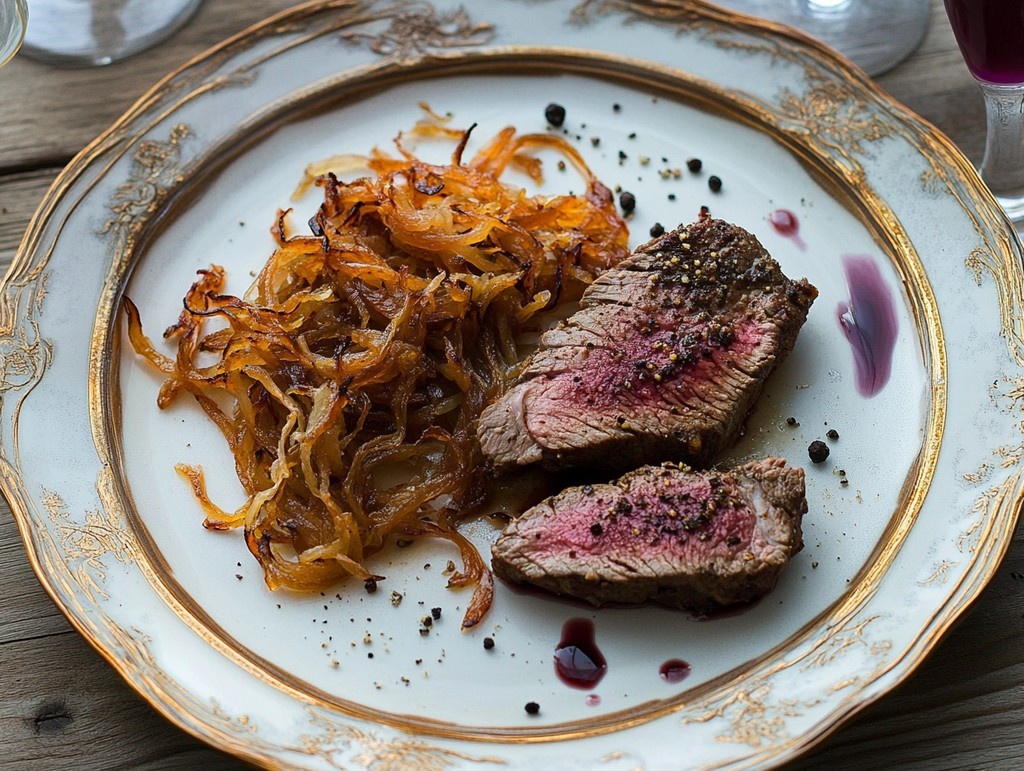 - Оленину нарезать на стейки и обжарить на оленьем жиру до готовности.