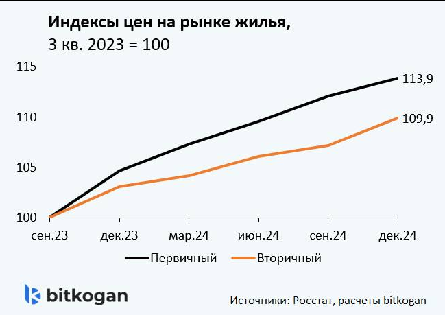 По официальным данным Росстата, с сентября 2023 года по конец 2024-го (5 кварталов) новостройки подорожали на 13,9%, а вторичка — на 9,9%. Впечатляющий рост за такой короткий срок. Пока одни ждали обвала и надеялись купить дешевле, другие просто брали и покупали. И, как видим, не прогадали.