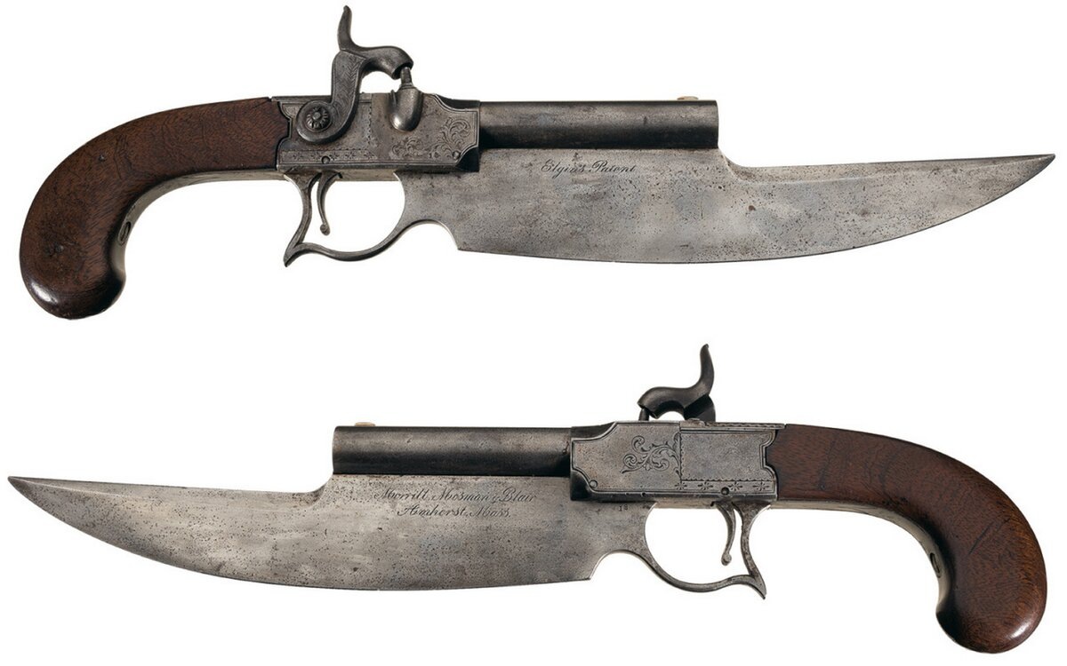С появлением первого огнестрельного оружия, многие оружейники пытались соединить его с холодным. На первых порах делалось это из практических соображений, ведь порох и кремний мог отсыреть, намокнуть, да и длительная перезарядка огнестрельного оружия могла плохо обернуться для владельца, поэтому на помощь приходил нож. Пистолет-меч – уникальное гибридное оружие, предназначенное в первую очередь для использования в ближнем бою, причём пистолет служит дополнением. В отличие от винтовок со штыком, пистолет-меч неразъёмный. Пример – пистолет-мачете Elgin Cutlass. Он был разработан и запатентован Генри Моррилом, Силасом Мосманом и Чарльзом Блэром в 1837-38 годах. Уникальный дизайн сочетал в себе пистолет с ножом типа Боуи. Военно-морской флот США заключил контракт на 150 пистолетов Elgin Cutlass, чтобы вооружить Экспедицию Южных морей в 1837 году. Массивное лезвие предназначалось для использования в качестве кусторезов на опасной территории. Тяжелый нож очистит джунгли, а пистолет будет гот