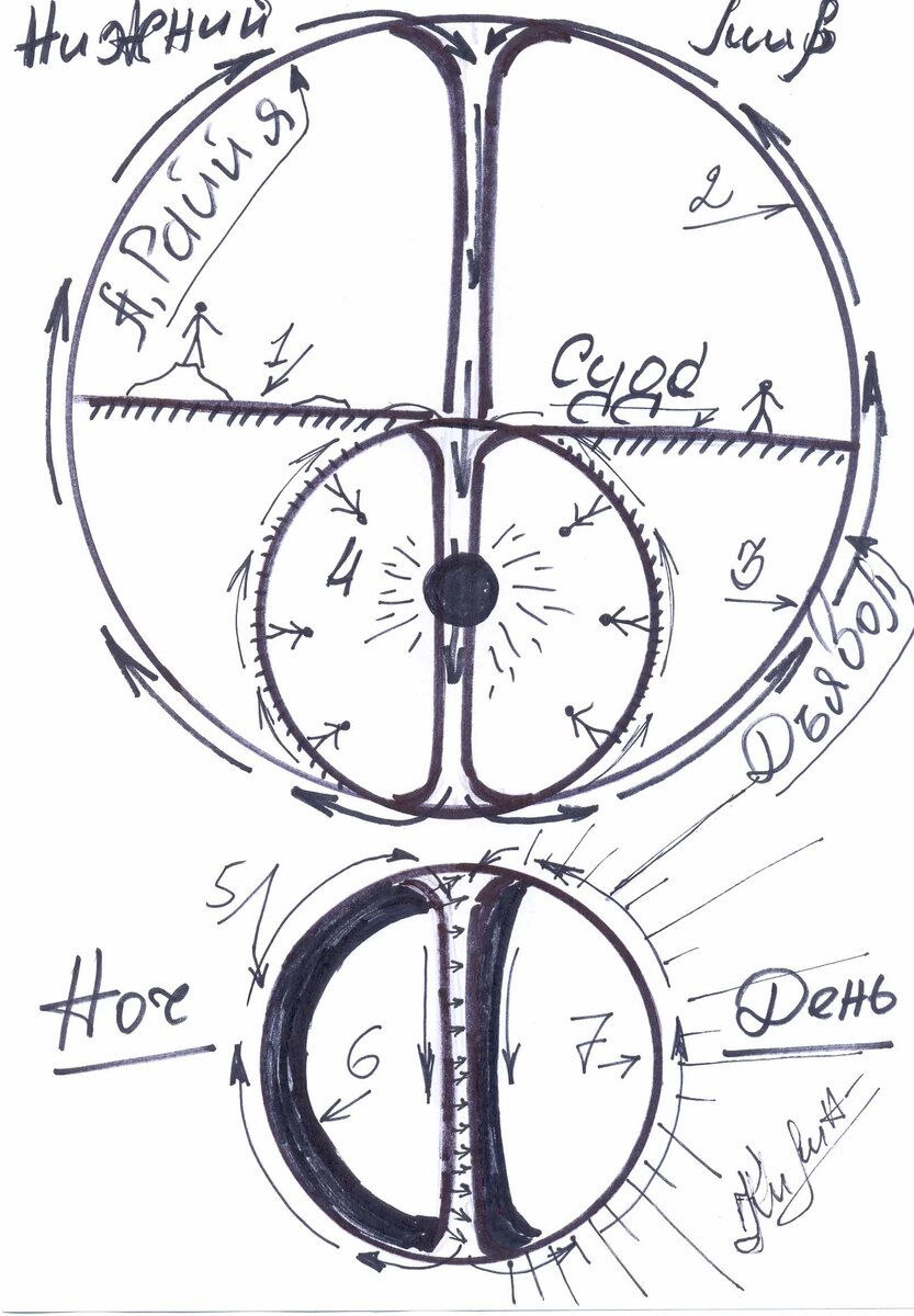 Заключение. В данном заключительном разделе, я бы хотел, очень коротко, рассказать о последнем окружении вашего мира, который является прямым продолжением поверхности вашей земли, и данное окружение, является самым значительным для вас, и проживающие в самой не посредственной близости от вас, очень сильно влияют на историю вашего мира. Как ни странно, но прямыми соседями вашего мира, являются представители разумной жизни, живущие не в соседних сотах вашей Палеи, а те соседи, которые живут над вами, и под вами. Предлагаю начать с Нижнего Мира. На рисунке 1, изображена поверхность вашей Суды, окруженная информационной сферой, которая в свою очередь, разделена на две полу сферы, на верхнюю А,Раийю, и нижнюю Дьявола. Сферу информационного поля, формирует Малый Палейный Салтан, который имеет в центре, тоннель высоких энергий, проходящий через физический Северный Полюс Земли. Ваш мир, является виртуальным, а каждый Салтан, создаёт резервную Ариадническую уменьшенную копию самого себя, на случай сбоя центрального Палейного Салтана. Ариадническая копия, в свою очередь, создаёт свой физический мир, пригодный для проживания в нём, всех жителей верхней ячейки. Под поверхностью вашей Суды, тоже есть Ариадничесакая копия, которую формирует Агартамический дочерний Мини Салтан, рисунок 4. Нижняя часть тоннеля высоких энергий, у Салтана вашей Суды, и тоннель высоких энергий Агартамического Салтана, являются одним целым. Диаметр так называемой вами "Полой Земли", равен половине диаметра плоскости вашей судной ячейки. Уникальность нижнего мира в том, что попасть с вашего Северного Полюса в Нижний Мир, очень сложно и практически не возможно, но если вы в него попадете, то выйти, сможете как на Антарктиде, так и в соседней Палейной Ячейке. Светилами во всех нижних мирах во всех Паллессидах, служат так называемые Терминаторные (Терминационные) Салтаны, которые находятся на общем тоннеле высоких энергий, и по середине Агартамиды (дочери Судного Салтана (по преданию)). И так, Палейный (Палессидный) Салтан, формирует множество Салтанов на поверхности своего поля, для каждой ячейки, Салтан каждой ячейки, формирует дочерний Агартамический мини Салтан, или Агартамиду, которая создаёт свой физический внутренний мир (внутреннюю полость ячеки). А вот для освещения полости внутреннего мира, Агартамида, создаёт микро Терминационный Салтан, рисунок 5. Все терминационные Салтаны, правильно называются Шива - Выва, или Шиворот на Выворот. Половина поверхности ШиВи, является света поглощающей рисунок 6, а вторая поверхность рисунок 7, излучает сильный живительный Свет и тепло. По мере выворачивания на изнанку ШиВа, день и ночь, во внутреннем мире Суды, меняются местами. Со стороны Арктического прохода, в Агартамиде, находится Запад, а со стороны Антарктиды, находится восток, и от туда в полость земли, приходит день. Когда находишься в Агартамиде, то очень занятно смотрится восход, когда с одной стороны, сначала появляется яркое пятно, которое затем, поглощает светом весь внутренний мир. И уж тем более, впечатляет закат когда весь свет внутреннего мира, медленно фокусируется водной точке и затем, наступает полная ночь. В тоннеле высоких энергий, длинна сжимается, и по этому, происходит как полный день, так и полная ночь. Теперь, предлагаю перейти к Верхнему Миру, который с