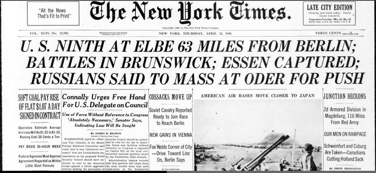 Казаки вступили в гонку с союзниками за Берлин, советские войска продолжают штурм австрийской столицы, подразделения Второго и Четвертого украинских фронтов соединились в Словакии, говорится в статье NYT от 12 апреля 1945 года. Главное направление удара - к резиденции Гитлера в Берхтесгадене. ИноСМИ приводит эксклюзивный перевод архивной публикации.