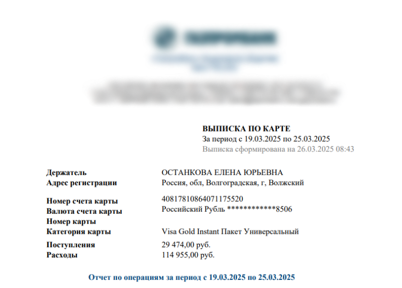 Скриншот выписки по карте, предоставленной Еленой Юрьевной Останковой