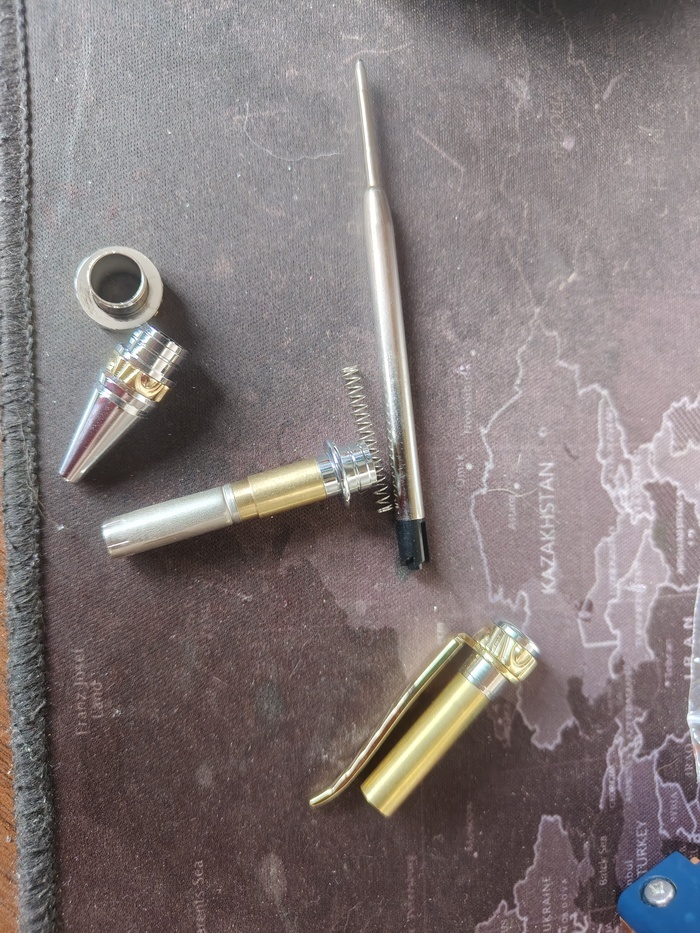 Что-то приболел, полноценно шуметь нельзя, пылить тоже, а руки чешутся. Лежали у меня несколько наборов от братьев наших китайских для изготовления шариковых ручек. Решил их и сделать. Работа - простейшая токарка, само то, что нужно, чтобы без напряга. Сам набор приблизительно вот такой. Они плюс минус одинаковые. На удивление хорошо сделаны, размеры все четкие, до соток, все стыкуется и впресовывается без проблем. Не смотря на кажущуюся хрупкость одна из таких ручек, подаренная начальнику, трудится уже больше 6 лет и механизм хорошо выдерживает свои небольшие нагрузки.