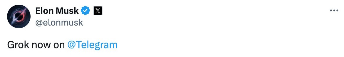 Илон Маск подтвердил интеграцию чат-бота Grok в Telegram. Чат-бот доступен бесплатно обладателям премиум-подписки в мессенджере.