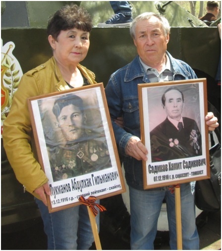 Мой дедушка, выходец из Бураево, Хамит Садикович Садыков, родился в 1910 году. В 1941-м он был направлен на Челябинский тракторный завод собирать танки. А через год на собственноручно собранном танке ушёл на фронт на Орловско-Курское сражение. Из 125 танкистов в живых остались только 11. Один из них – тяжелораненый, обгоревший Х.С.Садыков. Он награждён медалью «За отвагу». После госпиталя участвовал в тяжёлых боях на Прибалтийском и Ленинградском фронтах, где вновь получил ранения, а позже − орден Великой Отечественной войны второй степени.