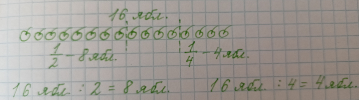 Нарисуем 16 яблок. Что нужно сделать, чтобы найти 1/2? (Разделить все яблоки на 2 части). Значит, внукам бабушка отдала 8 яблок.