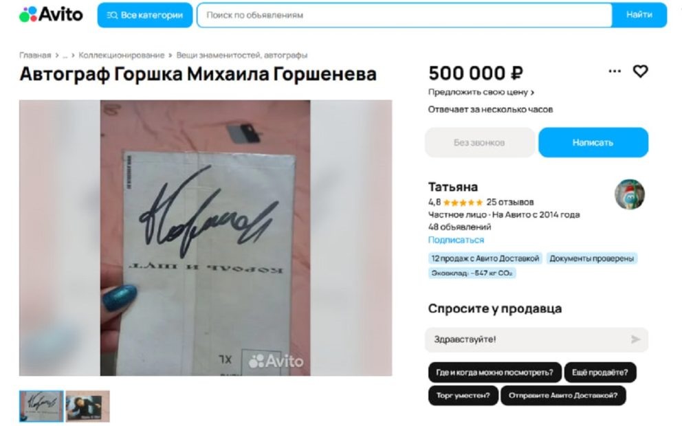 По словам автора объявления, подпись на фирменной открытке со своей фотографией легендарный рок-исполнитель Михаил Горшенев, более известный как «Горшок», поставил перед началом концерта в феврале 2002 года.