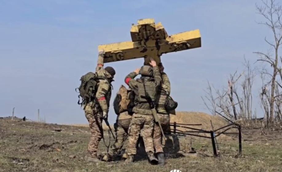 Видео снято на окраине недавно освобожденного населенного пункта Свердликово. На кадрах видно, что из-за большого размера и тяжести креста его поднимали пятеро военнослужащих.