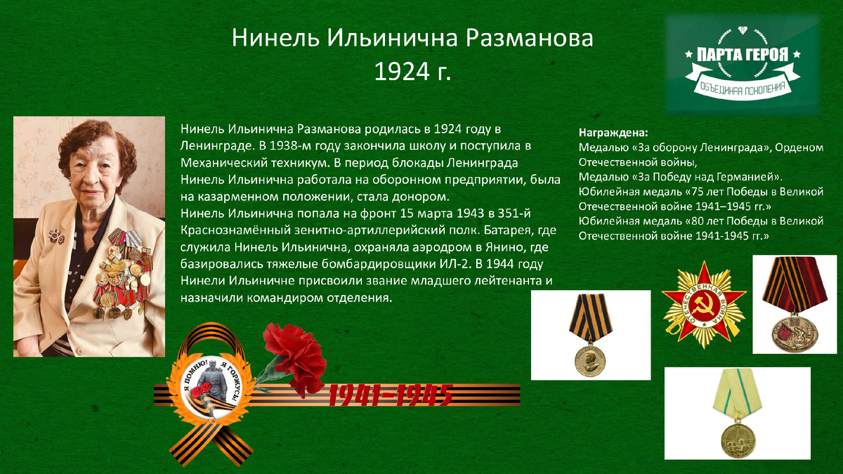 #Трек5 "Разработка проекта Парты героя" Команда "Гардарика" разработали проект "Парты героя", которая посвящена Герою Великой Отечественной войны- Нинель Ильиничне Размановой (род. 1942 г.) Нинель Ильинична является жителем района, в котором расположена наша школа. В 2025 году Нинель Ильинична отмечает 101 год! #80ДобрыхДелКПобеде #ФКР #ФорумКлассныхРуководителей #Сферум80ДобрыхДел