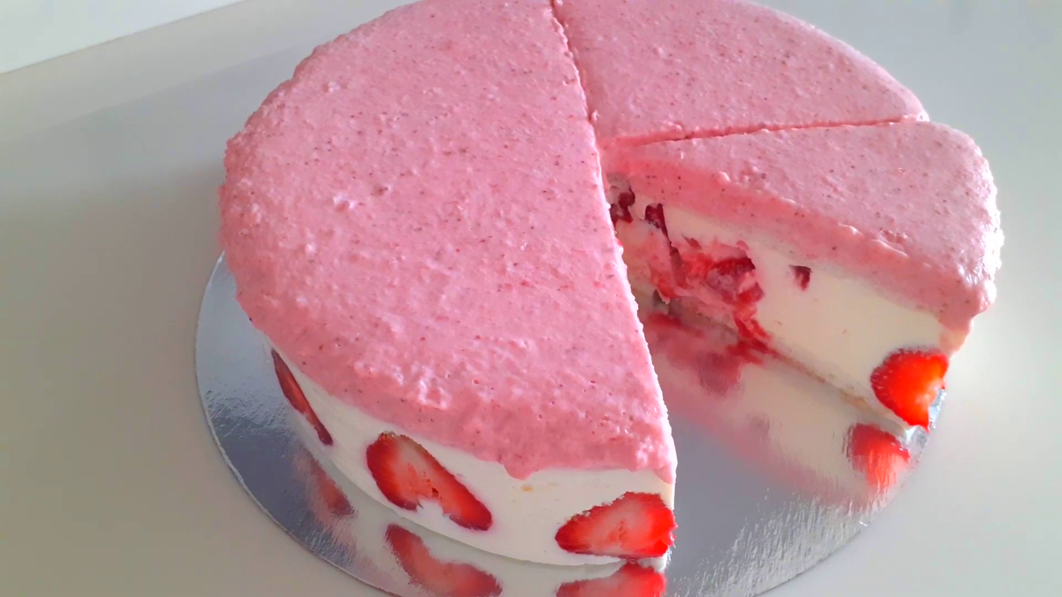Готовлю классический французский, клубничный торт Фрезье. Торт получается настолько нежным и вкусным, что стал национальным достоянием Франции. Бисквит: Суфле: Конфи: Начинка: Общий выход готового изделия составляет 2,5 кг. Яичные белки взбиваю с сахаром и солью, до пышной меренги. Всыпаю: муку, разрыхлитель и крахмал. Перемешиваю недолго миксером. Выкладываю белковое тесто в разъёмную форму смазанной по бортам сливочным маслом и предварительно обтянутой по дну пекарской бумагой. Распределяю тесто по форме. Убираю форму с тестом в заранее разогретую до 160С духовку на 20 минут. Для суфле в сотейник с молоком всыпаю сахар и непрерывно перемешиваю на плите. Активно перемешивая венчиком желтки, вливаю горячий молочный сироп. Переливаю смесь обратно в сотейник. Активно перемешиваю на средней мощности плиты, чтобы заварная основа не свернулась. Как только на заварной основе образовался белый налёт и она немного загустела, это говорит о её готовности. Если есть градусник, то температура гото