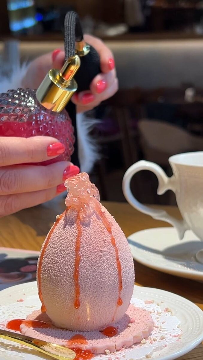 Сам десерт в виде спонжика с малиновым вкусом. К нему подают инструкцию - сначала вы наносите сыворотку на него, потом тональное средство, посыпать румянами и пудрой и пару пшиков парфюма - десерт готов! Отдельно можно съесть помаду, она как конфетка. Стоит такой десерт 1200₽, лучше звонить заранее и бронировать его, а то можете не застать. Это ресторан Nomad - средиземноморский ресторан с атмосферой Патриков на Петроградке с безукоризненным сервисом и обслуживанием. Это идеальное место для встреч с подругами как на завтраках (поздние завтраки до 15:00), так и вечером, за бокалом коктейля. Здесь же подают шампанское в огромном бокале 😳 📍Санкт-Петербург, ул.Ленина, 18 Подписывайся 😉