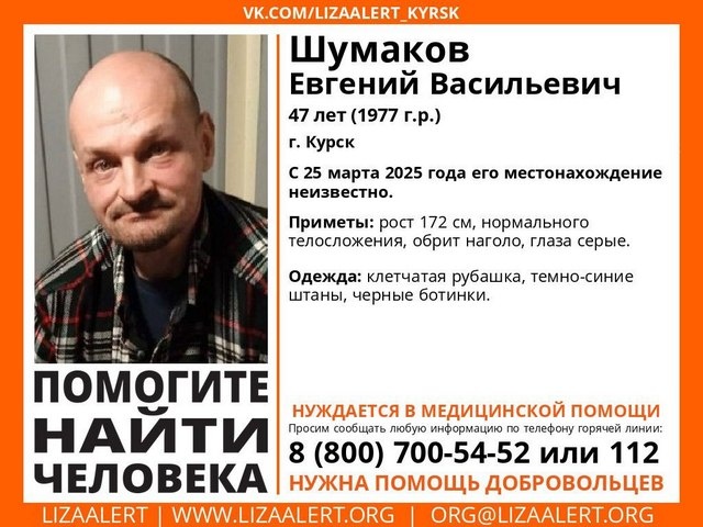 По данным волонтеров, пропал Шумаков Евгений Васильевич. Его местонахождение неизвестно с 25 марта.