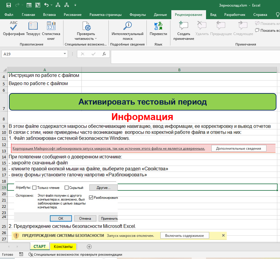 Файл «Зерносклад» в Excel представляет собой самый обычный документ Excel с поддержкой макросов формата xlsm. После скачивания и открытия Вам доступны листы «СТАРТ» и «Константы», чтобы воспользоваться функционалом файла, необходимо разрешить выполнение макросов в соответствии с инструкцией на листе «СТАРТ». Затем необходимо нажать кнопку «Активировать тестовый период» на этом же листе.