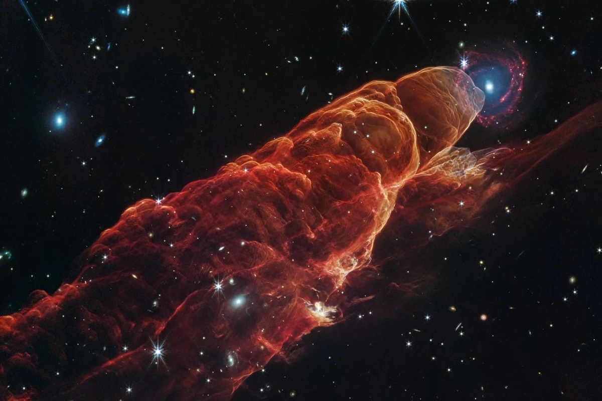 Космический телескоп Джеймс Уэбб передал NASA изображение потока Herbig–Haro 49/50 (HH 49/50, или объект Хербига-Аро), который находится на расстоянии 630 световых лет от Земли. Хербиг-Аро — протозвёздный поток, образующийся в джетах звезды, или светящаяся туманность.