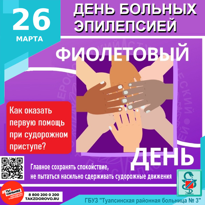 Эпилепсия – это хроническое неврологическое расстройство. Во время судорожного приступа необходимо: - сохранять спокойствие, не пытаться насильно сдерживать судорожные движения; - по возможности уложить человека на ровную поверхность, подложить ему под голову что-нибудь мягкое, расстегнуть воротник и освободить от тесной одежды; - не перемещать человека с того места, где случился приступ, если только оно не является опасным для жизни (острые углы, вода и т.д.); - повернуть голову на бок для предотвращения западания языка и попадания слюны в дыхательные пути, а в случаях возникновения рвоты осторожно повернуть на бок все тело; - ни в коем случае не пытаться разжимать зубы какими-либо предметами; - не делать искусственного дыхания или массажа сердца; - не давать никаких лекарств или жидкостей через рот. Судороги прекратятся сами по себе через несколько минут. Подробнее на нашем сайте: https://hosp23.ru/medevents/573-purpleday.html