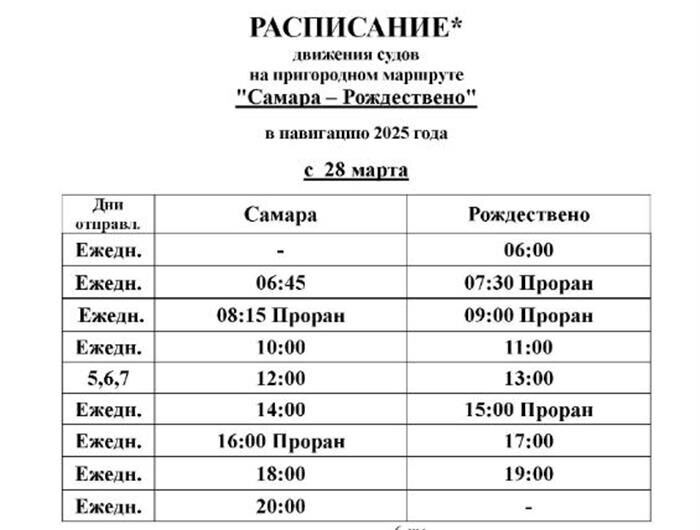 Из Самары стартуют рейсы в 6:45, а завершаются в 20:00. Из Рождествено первое теплоход отправляется в 6:00, заключительный рейс в 19:00, сообщает Самарское речное пассажирское предприятие.