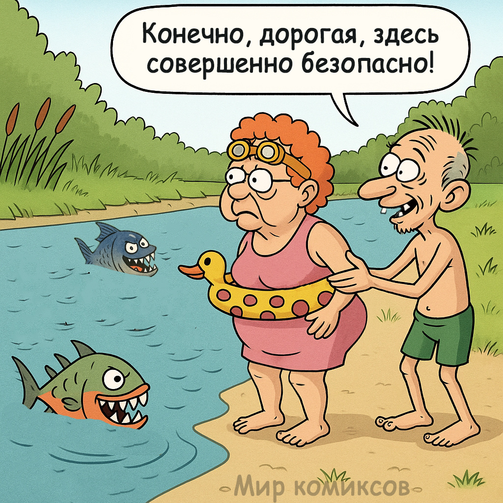 Стоит только солнцу припечь и тут же начинается великая миграция к воде. Кто с раскладушкой, кто с тазиком салата, кто с гордым видом словно только он знает лучшие места для отдыха. Всё бы хорошо, да вот незадача: как только ты оказываешься на берегу, реальность включает закон подлости. Удочки забыты, шашлыки пересолены, а соседи по полянке громко выясняют отношения. Карикатуристы обожают тему отдыха у воды, и не зря. И рисуют кто во что горазд. Да, немного переходят в драму, а то и в фарс. Но от этого только смешнее! Именно такие карикатуры про отдых сегодня собрал для вас наш блог «Мир комиксов». Так что каждый, кто хоть раз падал в речку или забывал крем от загара, узнаёт себя без слов. Отдых у речки — это вам не примитивная рекламная картинка, где человек лежит в шезлонге с коктейлем. В карикатуре он обязательно находит себе занятие поинтереснее. Вместо отдыха — рыбалка, вместо приятных впечатлений — совершенно незабываемые. Именно этот контраст и делает такие рисунки смешными: