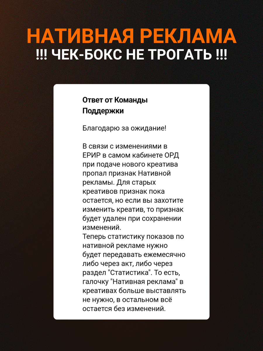 Вчера потеряла этот чек-бокс. Написала в техподдержку. У меня запросили скрин. Видимо обновление совсем свежее. Что делать? ✅ 1. Маркируем как обычную рекламу - коммерческую (блогерскую) или саморекламу. 2. Отчитываемся в разделах "Акты" или "Статистика" пока креатив не удален. 3. Старый чек-бокс "Нативная реклама" не трогаем! Иначе придется вечно отчитываться или удалять. 🦊 Увы и ах! Видимо на уровне Законодательства РФ сложно простить и принять этот вид рекламы. Но ничего страшного. Мои участники курса Маркировка рекламы в мессенджерах и соцсетях умеют маркироваться. Со всем справимся вместе. 📕 До встречи на курсе!