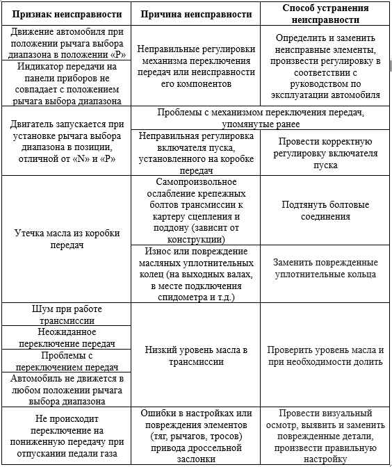 Автоматическая трансмиссия, имеющая сложную конструкцию, может вызвать трудности при попытках самостоятельного ремонта. Когда возникают неисправности, лучше всего обратиться к профессионалам в автосервис. Тем не менее, существует ряд распространенных проблем, которые автомобилист может решить самостоятельно. В данной таблице мы рассмотрим эти неисправности и предложим возможные пути их устранения.