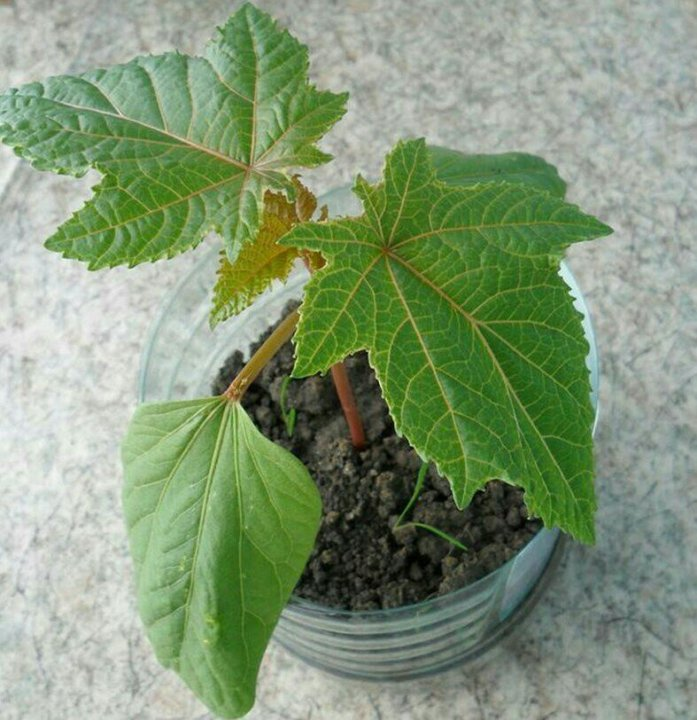 Выращивание клещевины начинается с рассады. Я сею семена в середине марта, предварительно немного нарушив оболочку (для этого немного тру их об обыкновенную строительную "шкурку"), далее замачиваю их в растворе "Циркона", на 4 часа. Важно! Не забудьте надеть перчатки при работе с семенами клещевины, так как они содержат ядовитое вещество — рицин. Сажаю по одному семечку в отдельные горшочки, так как клещевина плохо переносит пересадку. Грунт использую лёгкий и питательный.