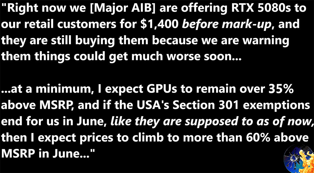 Крупный источник среди партнеров-производителей (AIB) сообщил MLID, что они предлагают "5080 нашим розничным клиентам по цене более $1,400 до наценки". Однако розничные продавцы продолжают покупать RTX 5080 по такой высокой цене, потому что производитель предупредил их, что "скоро ситуация может значительно ухудшиться", по крайней мере для американских геймеров.