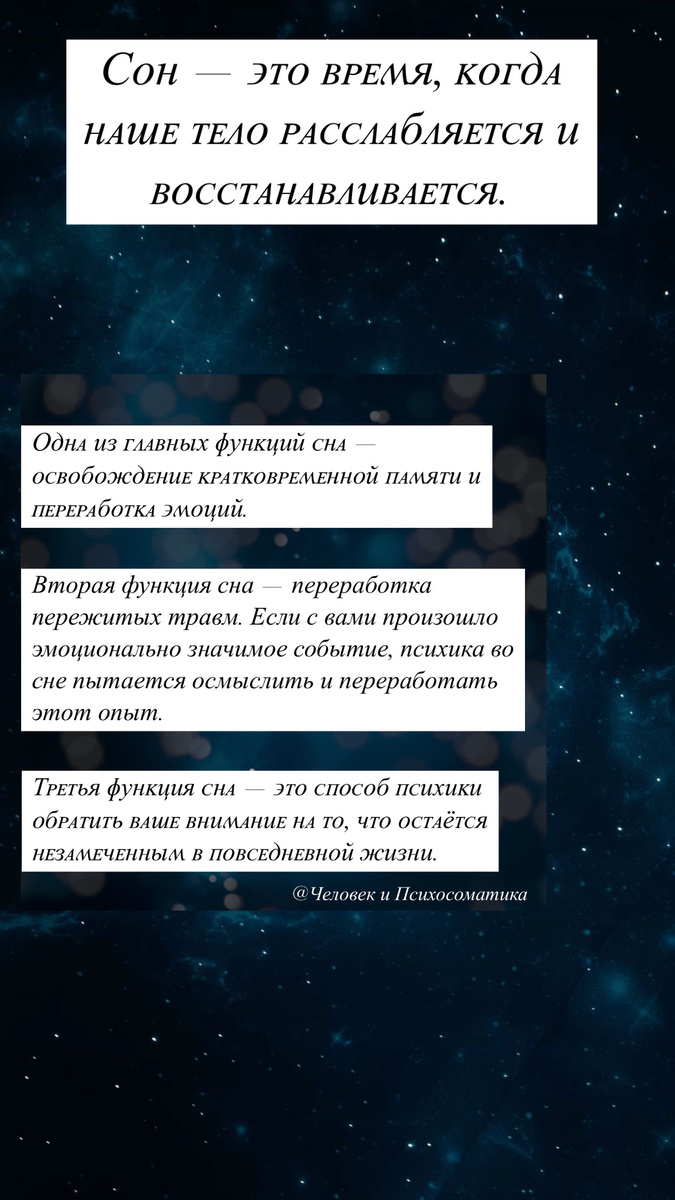 Страшные сны — это естественная часть работы мозга, если человек переживает сильные эмоции или тревожится о чем-то, мозг может воспроизводить эти переживания в кошмарах. Иногда сны показывают то, что человек боится, даже если он не думает об этом в повседневной жизни. Мозг использует сны, чтобы анализировать и «переваривать» полученный за день опыт. Болезнь, жар, неудобная поза во сне или даже слишком плотный ужин могут вызвать кошмары. Когда человек смотрит фильмы ужасов, страшные истории или даже тревожные новости перед сном могут повлиять на сновидения. А тебе часто снятся страшные сны? Есть такие, которые запомнились? Поделись в комментариях, очень интересно почитать! Сны выполняют несколько важных функций, хотя ученые до сих пор точно не знают, зачем они нужны. Вот несколько возможных объяснений: 1. Обработка информации – во сне мозг сортирует впечатления, воспоминания и переживания, помогая нам лучше понимать окружающий мир. 2. Эмоциональная разрядка – сны помогают справлять