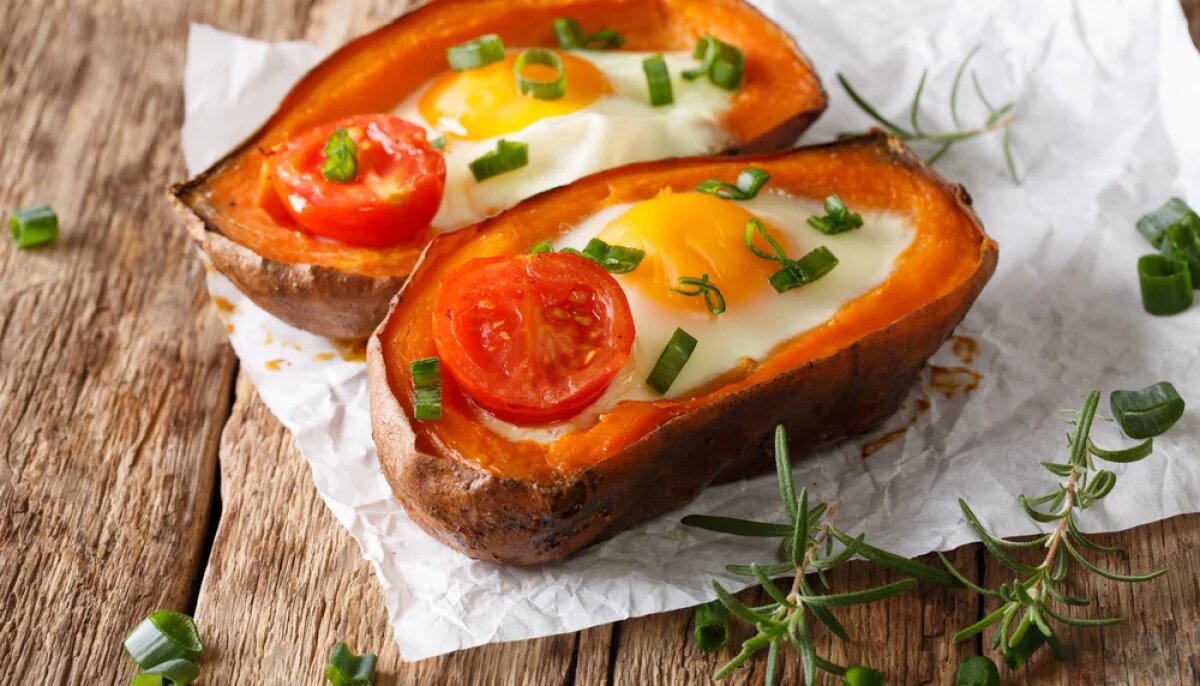 Patates douces farcies aux oeufs et à la tomate Лёгкое, презентабельное и полезное блюдо. Ингредиенты: 2 крупных батата 4 куриных яйца 4 помидора черри зелёный лук Соль, перец Предварительно нагреть духовку при температуре 200૦ С. Разрезать сладкий картофель вдоль, завернуть каждую половинку в алюминиевую фольгу. Запекать в течение 45 - 60 минут. Затем остудить батат. Разрезать каждый томат черри на две половинки. Затем ложкой достать часть мякоти из половинок и вбить туда по 1 яйцу, посолить и поперчить по вкусу. Снова поставить картофель в духовку на 10 минут. Достать фаршированный батат, украсить помидорами черри и зелёным луком. Bon appétit! #французскаякухня #полезная еда