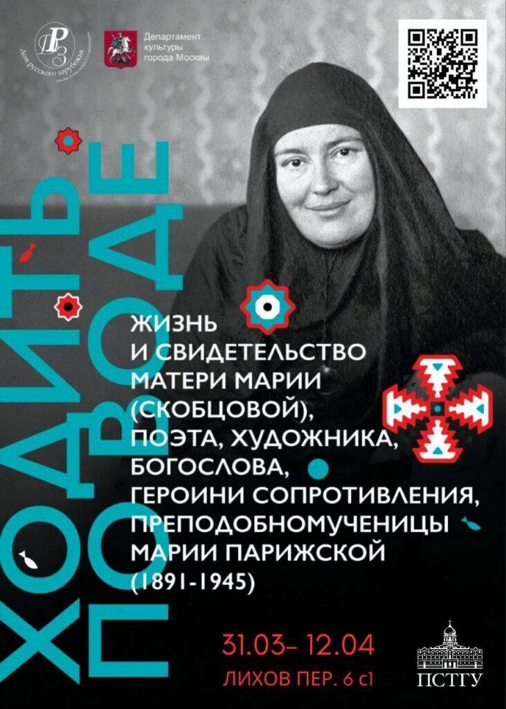 С 31 марта по 12 апреля в Главном здании ПСТГУ пройдет выставка, посвященная жизненному пути матери Марии, — «Ходить по воде: жизнь и свидетельство матери Марии (Скобцовой), поэта, художника, богослова, героини Сопротивления, преподобномученицы Марии Парижской (1891-1945)». Выставка подготовлена Домом русского зарубежья имени Александра Солженицына при поддержке Департамента культуры города Москвы.