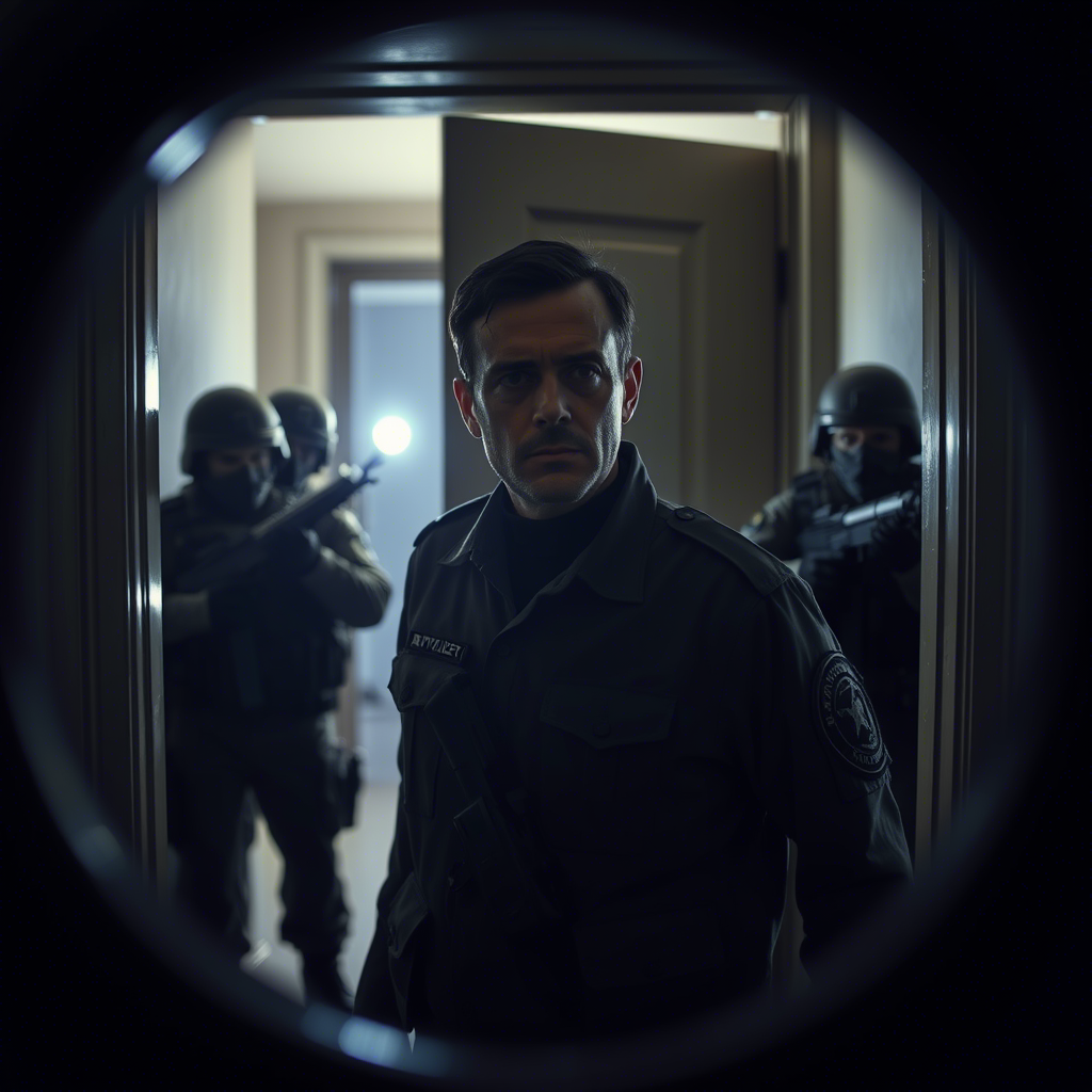 Темнота в глазке вдруг оживает: майор в бронежилете, за ним — силуэты с «аргументами».