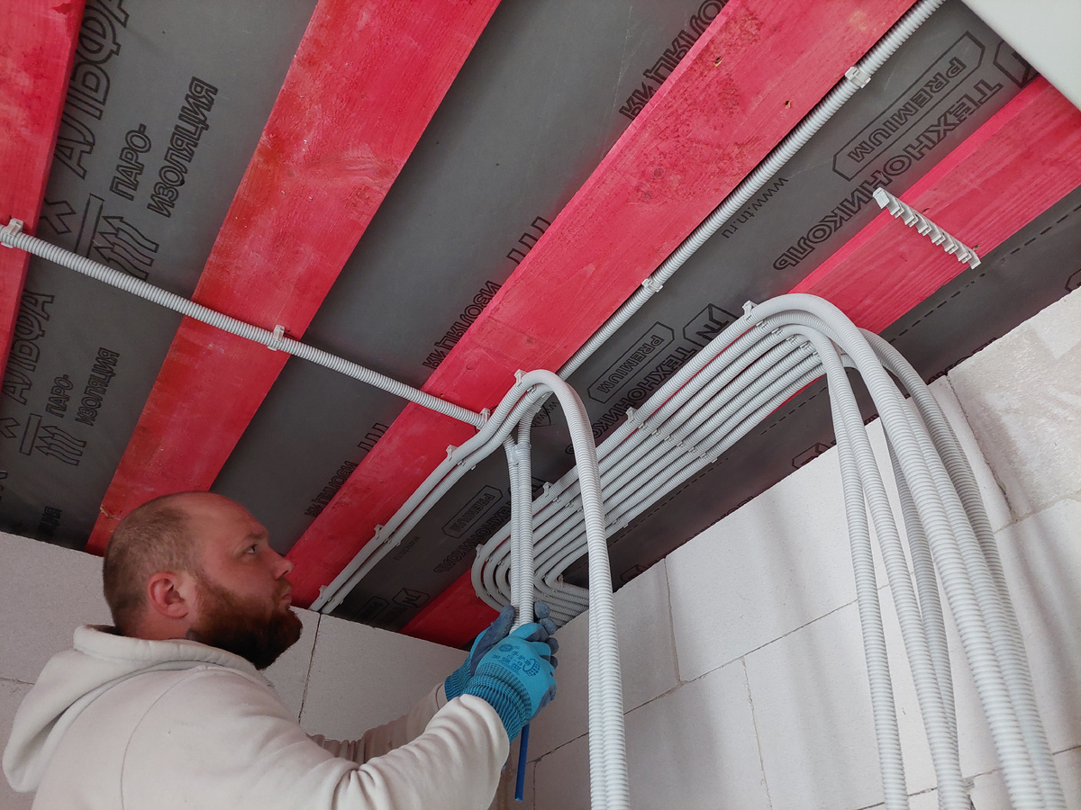 Первый этап электро-монтажных работ в доме по авторскому проекту площадью 180 м2 в коттеджном посёлке Напрудное. Собственник захотел построить не просто красивый и качественный, но ещё и умный дом. Часть инженерных коммуникаций на этом объекте будет управляться системой HiTE PRO, для которой электрики «СК Авторитет» предусмотрели отдельный распределительный щит. Заказчик сможет включать, выключать, а также регулировать уровень освещения в своём жилище дистанционно с помощью смартфона Силовой бронированный кабель сечением 10 мм2 заведён в дом под землёй в двустенной трубе. Аналогичным способом, но только в жёсткой ПНД-трубке проложено оптоволокно для интернета. Для стабильной работы интернета и умных устройств понадобилось 260 метров витой пары Suprlan Standard u/utp cat5e 4pr awg24 cu pvc indoor. На освещение было израсходовано порядка 1050 метров ГОСТовского кабеля «Русский свет» ВВГ-Пнг(А)-LS 3х1.5. Для розеток и мощных потребителей ушло 750 метров кабеля «Русский Свет» ВВГ-Пнг(А)-LS