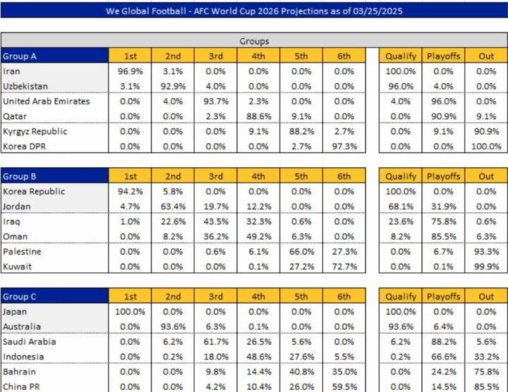 Аналитики также оценили перспективы сборной в рамках третьего раунда квалификации, где она выступает в группе А. По их расчетам, шансы Узбекистана занять первое место в группе составляют всего 3,1%. Однако вероятность финишировать на второй позиции, которая также дает путевку на чемпионат мира, значительно выше — 92,9%. Эти цифры основаны на текущих результатах команды и ее положении в турнирной таблице.