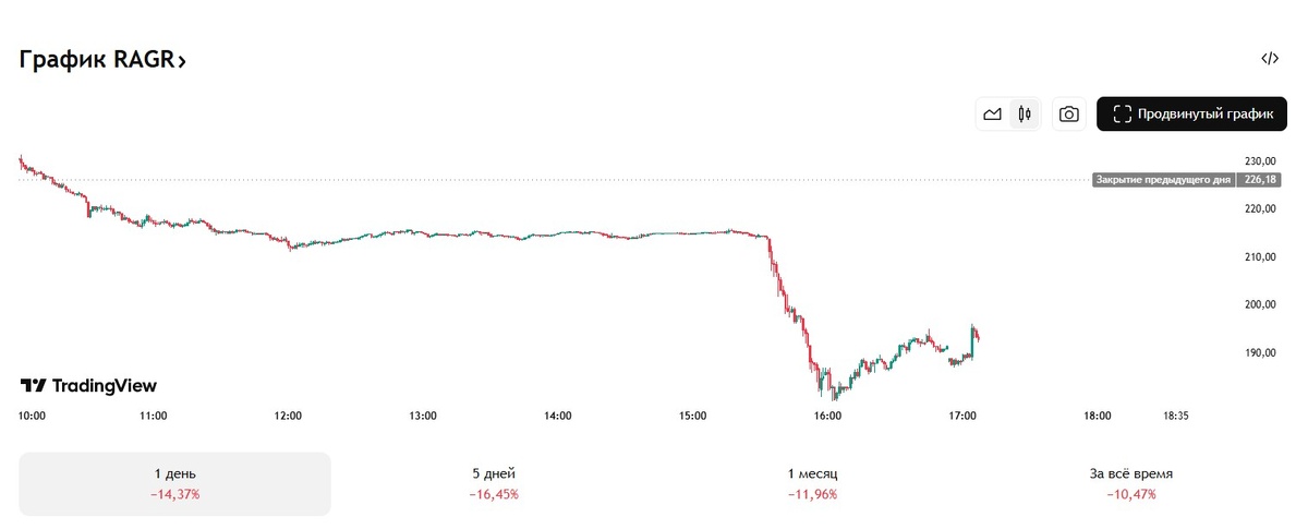 На этом фоне акции компании обвалились примерно на 16-17% (с 215 до 180 рублей за бумагу), далее обвал пока остановился, цена немного скорректировалась в район 190 рублей.