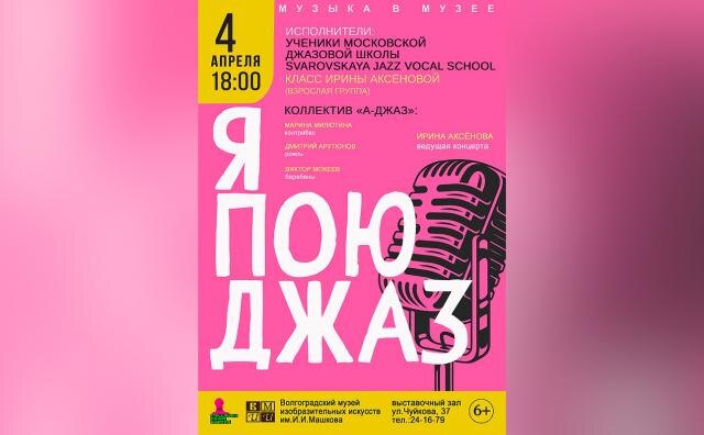 Выставочный зал Волгограда приглашает на концерт «Я пою джаз». Исполнители — учеников Московской джазовой школы. Её филиалом в Волгограде руководит наша замечательная певица Ирина Аксёнова.