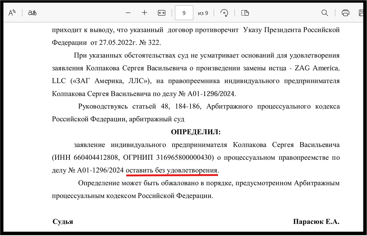 При указанных обстоятельствах суд не усматривает оснований для удовлетворения заявления Колпакова Сергея Васильевича о произведении замены истца - ZAG America, LLC («ЗАГ Америка, ЛЛС»), на правопреемника индивидуального предпринимателя Колпакова Сергея Васильевича по делу № А01-1296/2024".🙂👏