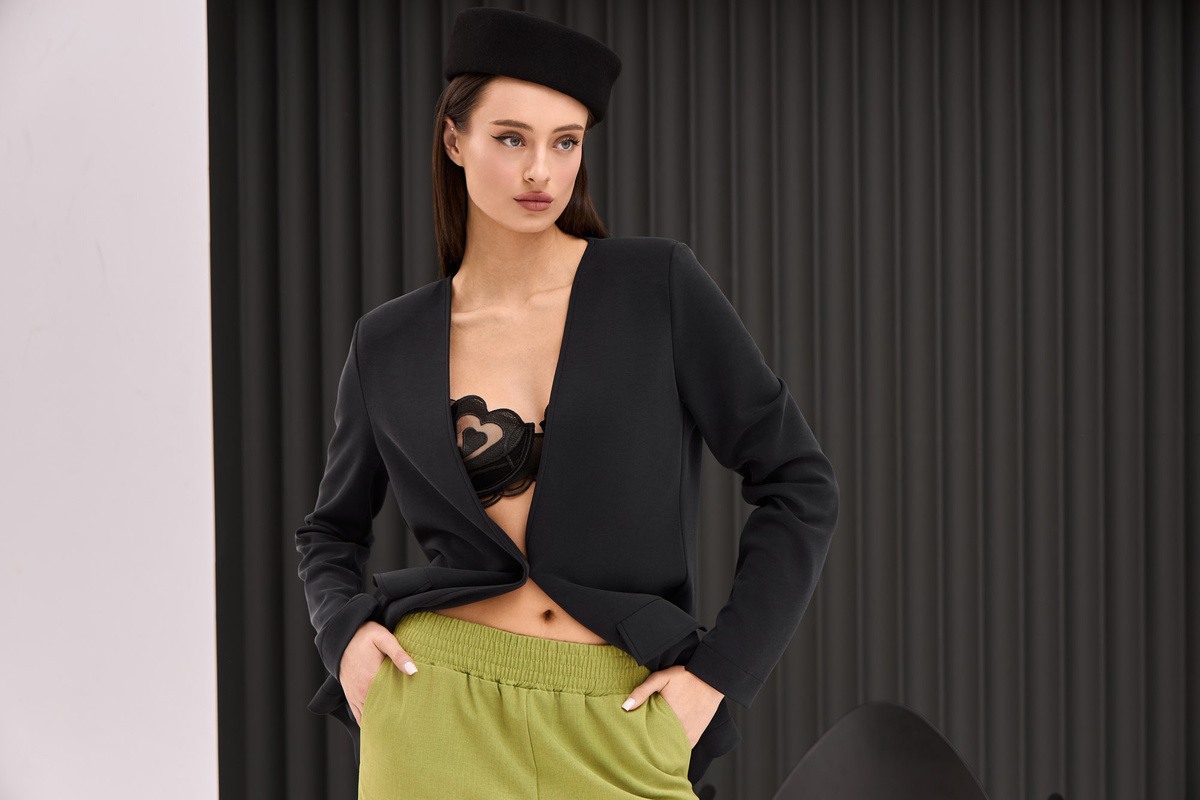Элегантный и современный черный пиджак, с длинными рукавами, карманами