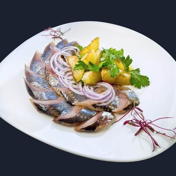 5) Перед подачей нарежьте селёдку на кусочки и подавайте с картофелем, хлебом или на закуску с луком и зеленью.