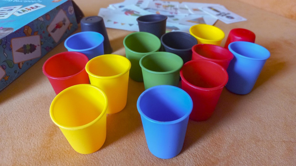 Настольную игру "Кто быстрее" (Быстрые стаканчики) я купила в Fix Price несколько лет назад. Люблю этот магазин за недорогие и интересные игрушки. Но у низкой цены бывает и обратная сторона. На чём-то же нужно экономить производителю. В моей игре это картинки-образцы. Их много, бумага плотная, рисунки разнообразные, но... цвета не всегда хорошо соответствуют ярким и безусловным цветам стаканчиков. То коричневый вместо жёлтого, то черный какой-то серый и больше похож на синий... Если быть честной, мою трехлетнюю дочку эти минусы не смущают. Она методом исключения находит всё же нужный цвет и выполняет задание правильно. А вот для ученицы с ТМНР (тяжёлые множественные нарушения развития) пришлось адаптировать. Игроки рассаживаются поудобнее, ставят по центру звонок, берут первую карточку из колоды и начинают максимально быстро раскладывать колпачки по цветам (в ряд или друг на друга) в той последовательности, которая указана на карточке. Первый, кто справился, нажимает на звонок и забир