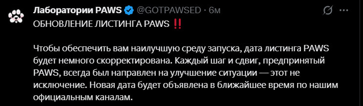 17 марта, разработчики Paws приняли неоднозначное решение, когда решили перенести дату листинга на неопределенный срок. В этот день разработчики сделали такой пост: Из-за чего вообще был перенос и когда все-таки листинг? Я считаю что переносы связаны с каким-то крупным партнерством, по слухам возможно листинг на бирже Binance. Но это только слухи. 22 марта крупная крипто-биржа HTX запостила пост в сети X, о токене Paws. Биржа HTX - это топ 15 по объему торгов, согласно coinmarketcap. Но наврятли из-за этого был перенос. 25 марта, в аккаунте одного из разработчиков появился недвусмысленный намек на дату листинга - 30 марта. В нашем телеграм канале, публикую последние новости из соцсетей Paws