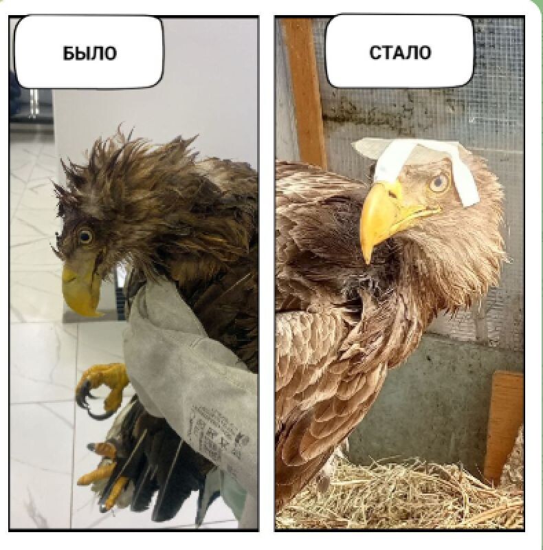 Ссылку на видео отправили в волгоградский центр. «Птичий остров» нашел автора видео и узнал, где находится хищник. Волонтеры отправились на место, которое указал автор, птичка все еще была там. Орлана поймать удалось не сразу, он греб своими мощными крыльями в центре речки, убегая от спасителей. Птицу все-таки удалось поймать. На орлана набросили плащ-палатку, подтянули к берегу и уже затем прыгнули за ним в воду. Птицу привезли в клинику. Выяснилось, что в орлана стреляли. Голова была пробита. Орлан оказался девочкой. Ему даже имя уже дали — Гриф