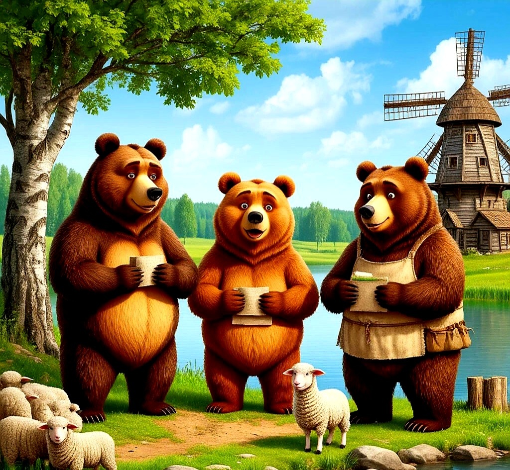 СКАЗКИ НА НОЧЬ ОТ Natasha-4. Жили-были три медведя - Михаил, Василий и Петр. Все они были очень умными и трудолюбивыми, но каждый из них имел свои интересы и увлечения. Однажды Михаил решил построить себе новый дом, а Василий решил заняться разведением овец, а Петр решил построить на берегу реки новую мельницу. Вскоре все три медведя начали работать над своими проектами. Михаил строил свой дом из камня и дерева, Василий разводил овец, чтобы продавать их шерсть, а Петр строил мельницу на берегу реки. Но однажды на лес напали волки. Они украли все, что было у медведей: овец у Василия, камень из дома Михаила и жернова с мельницы Петра. Медведи были очень расстроены и не знали, как им теперь жить. Тогда Михаил решил помочь своим друзьям. Он отправился к волкам и предложил им обмен: камни на овец, жернова на овец и т.д. Волки согласились и вернули все, что украли. Так медведи смогли продолжить свою работу и жить в мире и согласии. А волки больше не нападали на лес, потому что знали