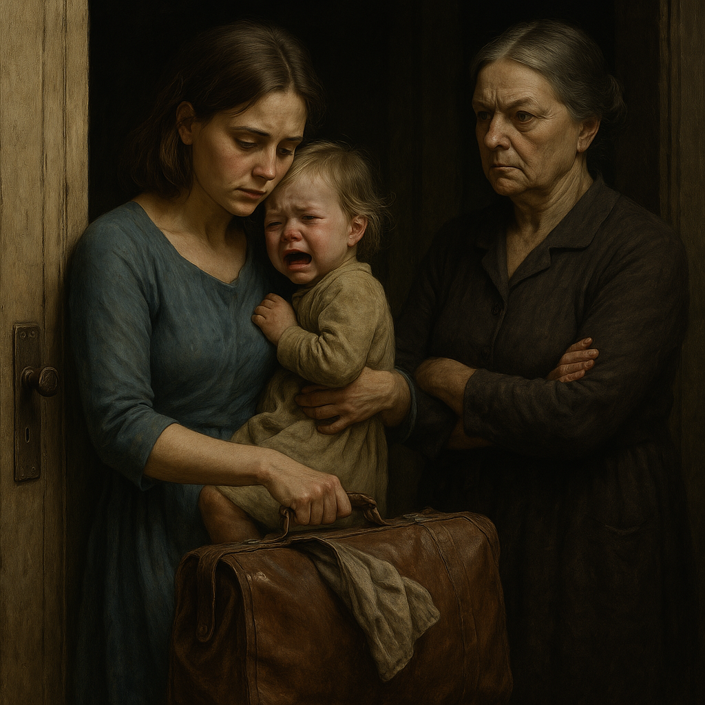 В прихожей было темно и душно, словно сумрак скрывал чужую боль. Анна беззвучно складывала вещи в потрёпанный чемодан, другой рукой придерживая свою плачущую годовалую дочь. Девочка уткнулась лицом в материнское плечо, словно пытаясь спрятаться от холодных и жестоких слов, которые звучали в полумраке.