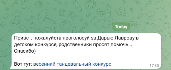 Недавно пользователи Telegram начали получать сообщения следующего содержания: "Привет! Пожалуйста, проголосуй за Дарью Лаврову в детском конкурсе, родственники просят помочь... Спасибо)" Именно вот такое сообщение мошенники отправляют пользователям с целью проглосовать в конкурсе. Перейдя по ссылке вы попадаете на фишинговый сайт мошенника. На первый взгляд, это обычная просьба о поддержке, но на самом деле такое сообщение является частью схемы мошенников. Перейдя по предоставленной ссылке, пользователь попадает на фишинговый сайт, принадлежащий злоумышленникам. Особую опасность представляет то, что сообщение может прийти от любого контакта в вашем Telegram — даже от родных и близких. Если нажать на кнопку «Проголосовать», следующая страница запросит сканирование QR-кода. Выполнив этот шаг, вы рискуете потерять доступ к своим данным и конфиденциальной информации, включая весь ваш Telegram-аккаунт. Будьте осторожны: никогда не переходите по ссылкам такого рода, даже если они поступили