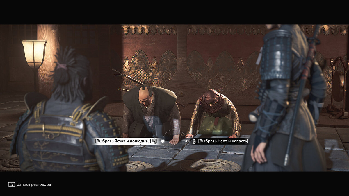 Если выбрать опцию с пощадой, Ясуке скажет, что нельзя строить мир без милосердия, иначе они будут не лучше тех, кого они свергли. Наоэ психанет и уйдет ждать его снаружи. Оити наградит Ясуке тем самым мечом Нобунаги, который вы видели в предыдущих квестах обучения, и намекнет на поиски других синбакуфу. После этого Ясуке подойдет к Наоэ, и она сперва будет в ярости, но потом скажет, что заметила симпатию между Ясуке и Оити. Жестокая правда в том, что они никогда не будут вместе из-за происхождения, о чем Наоэ тут же сообщит.