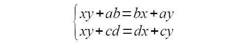 xy + ab = bx + ay ⇔ xy + ab – bx – ay = 0 ,