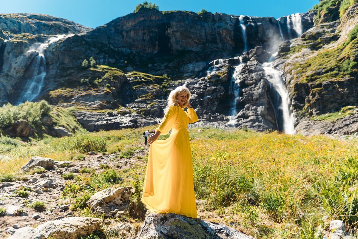 Софийские водопады называют визитной карточкой Архыза. Наверное, и Софийские озёра так можно назвать, просто к ним дойти сложней, и не все туда попадают (об озёрах-отдельные статьи). Сравнивать по красоте не буду, так как озёра и водопады- вещи разные. Мне понравилось и то, и другое. Но маршрут до водопадов действительно легче! Существует несколько легенд об этих водопадах (люблю я всякие легенды!), но у них общие действующие лица и общий смысл. Давным-давно летали боги над землёй и выбирали себе самые красивые места, чтобы строить себе святилища, отдыхать там и принимать дары от людей. Вот и бог Тейри, пролетая над Кавказом, облюбовал гору Софию. Призвал на помощь местных богов и духов. Один из них- властелин гор- опустил на вершину ледяной купол, другой- властелин лесов- рассадил вокруг деревья, цветы и травы, третий- властелин животных- заселил окрестности стадами коз и овец. Когда "рай на земле" был построен, сели боги во главе с Тейри пировать. Но не понравилась чужая радость и вл